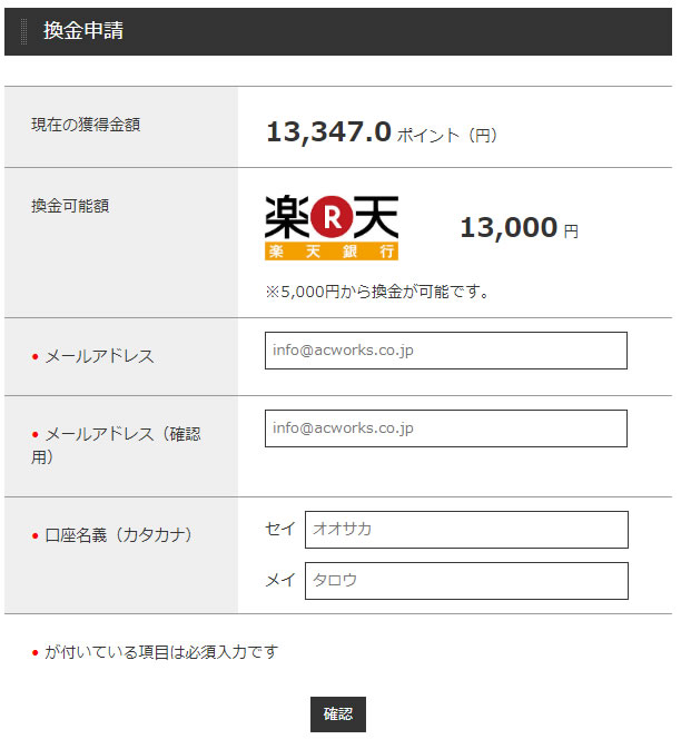 「メールアドレス」と「口座名義(カタカナ)」を入力して、「確認」ボタンをクリックします。