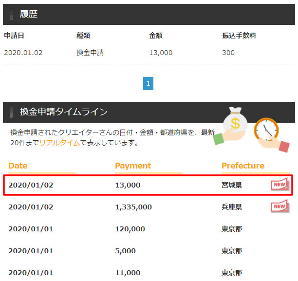 完了すると履歴と換金申請タイムラインに表示されました。